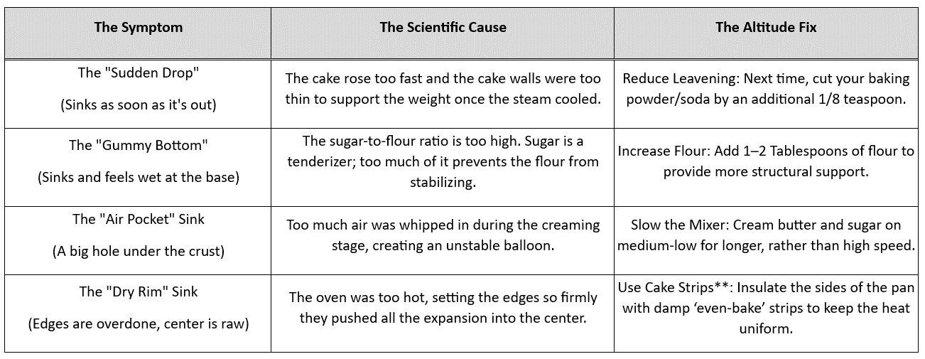 When a cake reaches the correct internal temperature but still sinks, it means the internal pressure (steam and CO2) was stronger than the protein structure (flour and eggs). At high altitude, this balance is incredibly delicate.